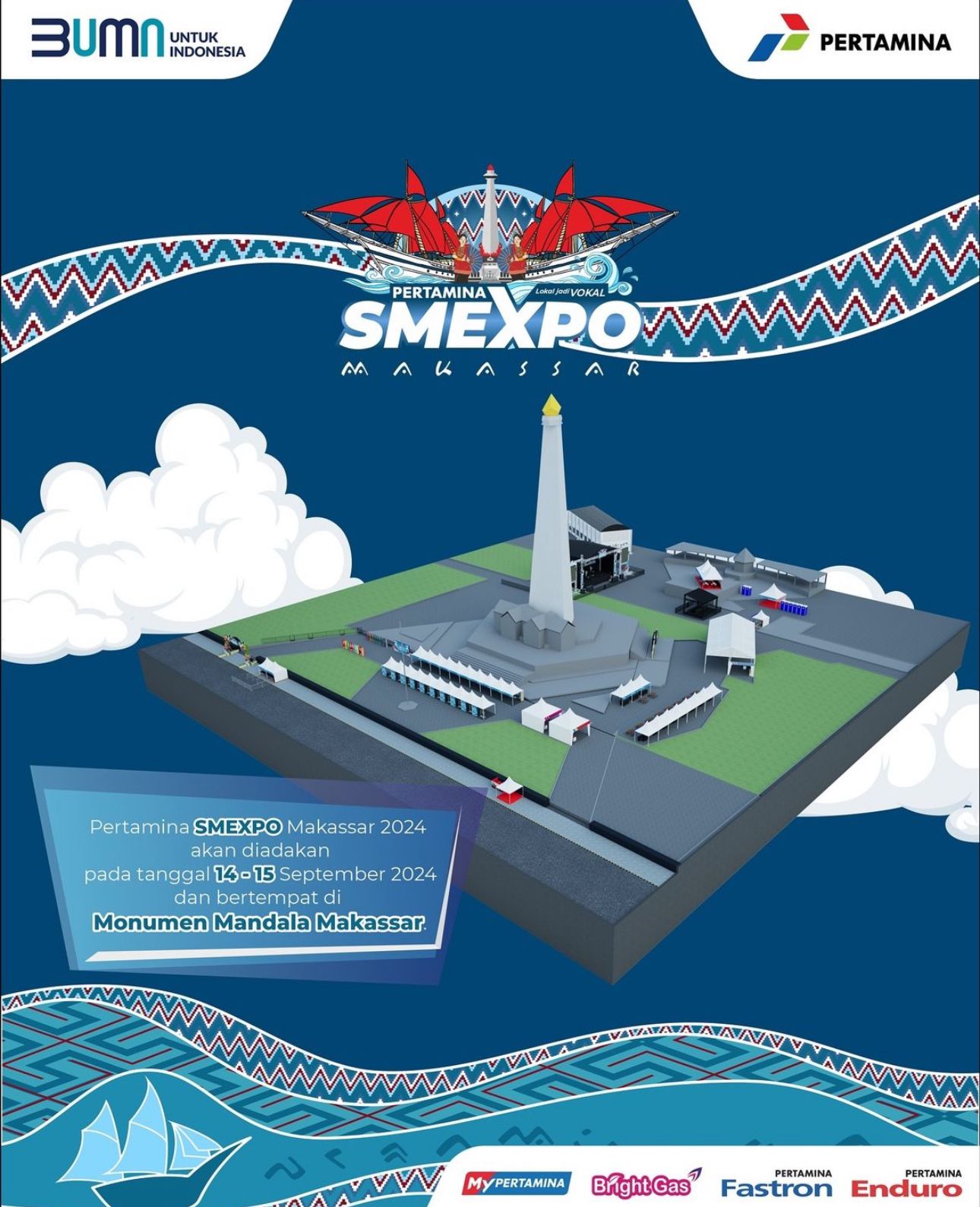 SMEXPO Pertamina di Makassar akan digelar selama dua hari dari tanggal 14 sampai 15 September 2024 di Monumen Mandala Kota Makassar. “Ini merupakan program rutin tahunan yang dilakukan sebagai wujud kontribusi Pertamina terhadap pembinaan dan pengembangan UMKM Indonesia. Dan Kami sangat antusias karena tahun ini Kota Makassar terpilih sebagai salah satu lokasi event”, ujar Fahrougi Andriani Sumampouw, Area Manager Communication, Relation, dan CSR PT Pertamina Patra Niaga Sulawesi.