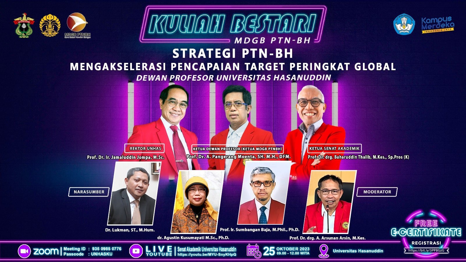BERITAINEWS, MAKASSAR – Majelis Dewan Guru Besar Perguruan Tunggi Badan Hukum (MDGB PTNBH) menyelenggarakan Kuliah Bestari secara virtual dengan Tema “Strategi PTNBH Mengakselerasi Pencapaian Target Peringkat Global” pada Rabu, 25 Oktober 2023 bertempat di gedung Rektorat Universitas Hasanuddin (Unhas).