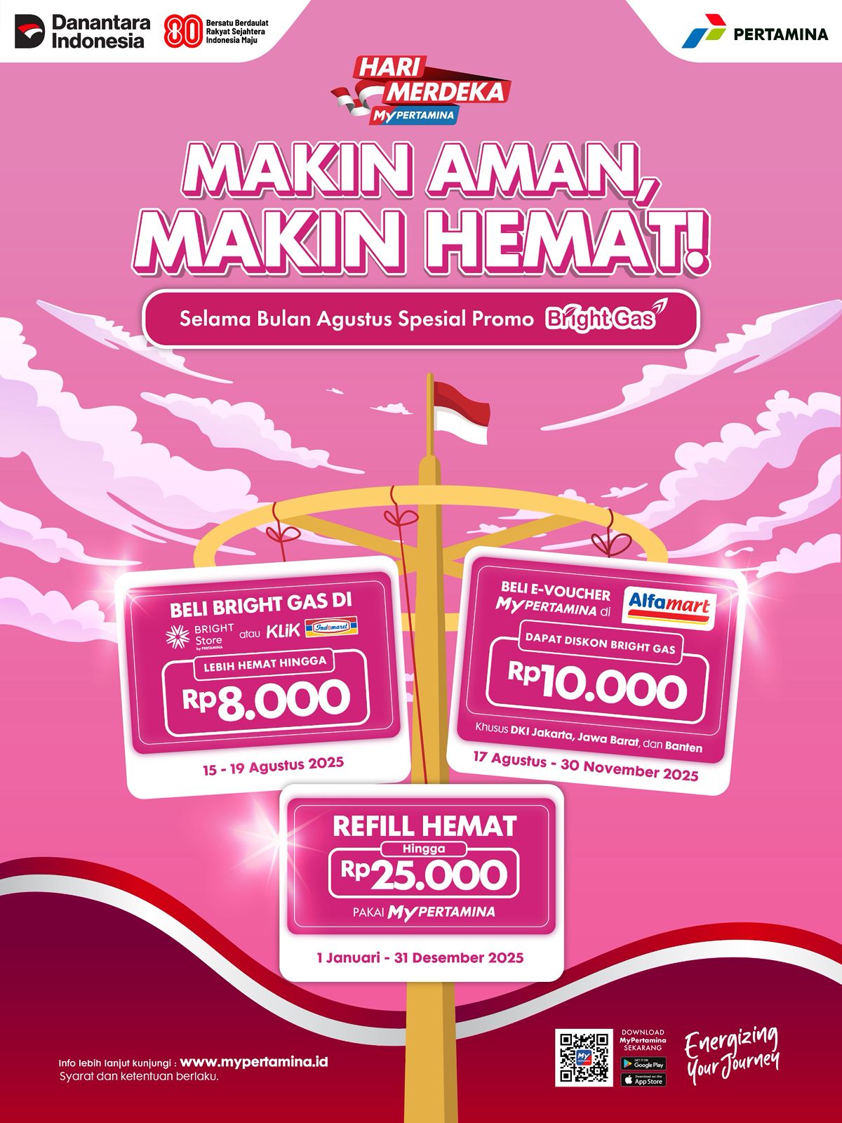 Selain itu, pelanggan juga dapat menikmati promo pembelian Bright Gas hemat hingga Rp8.000 melalui platform Klik Indomaret yang berlangsung pada periode 15 sampai 19 Agustus 2025. Promo ini diharapkan dapat membantu masyarakat memenuhi kebutuhan energi rumah tangga dengan lebih terjangkau.