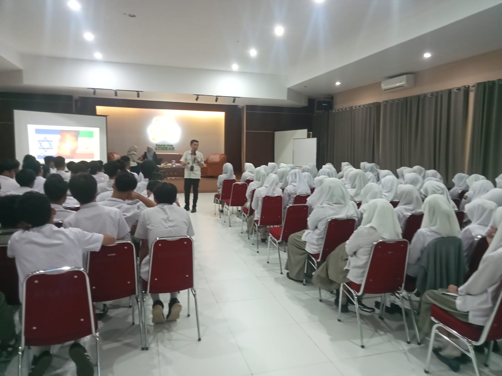 Kegiatan berlangsung interaktif melalui sesi tanya jawab. Para siswa tampak antusias mengajukan pertanyaan seputar kehidupan kampus dan tantangan perkuliahan.