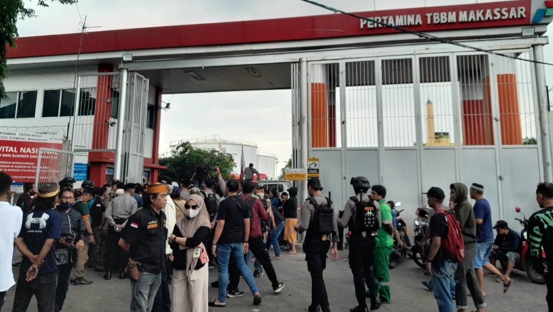 Pihak aparat kepolisian menarik diri masuk ke dalam TBBM Pertamina, namun massa masih terus melakukan aksi blokir gerbang akses pintu masuk yang menghambat bongkar muat atau aktifitas mobil keluar masuk ke TBBM.